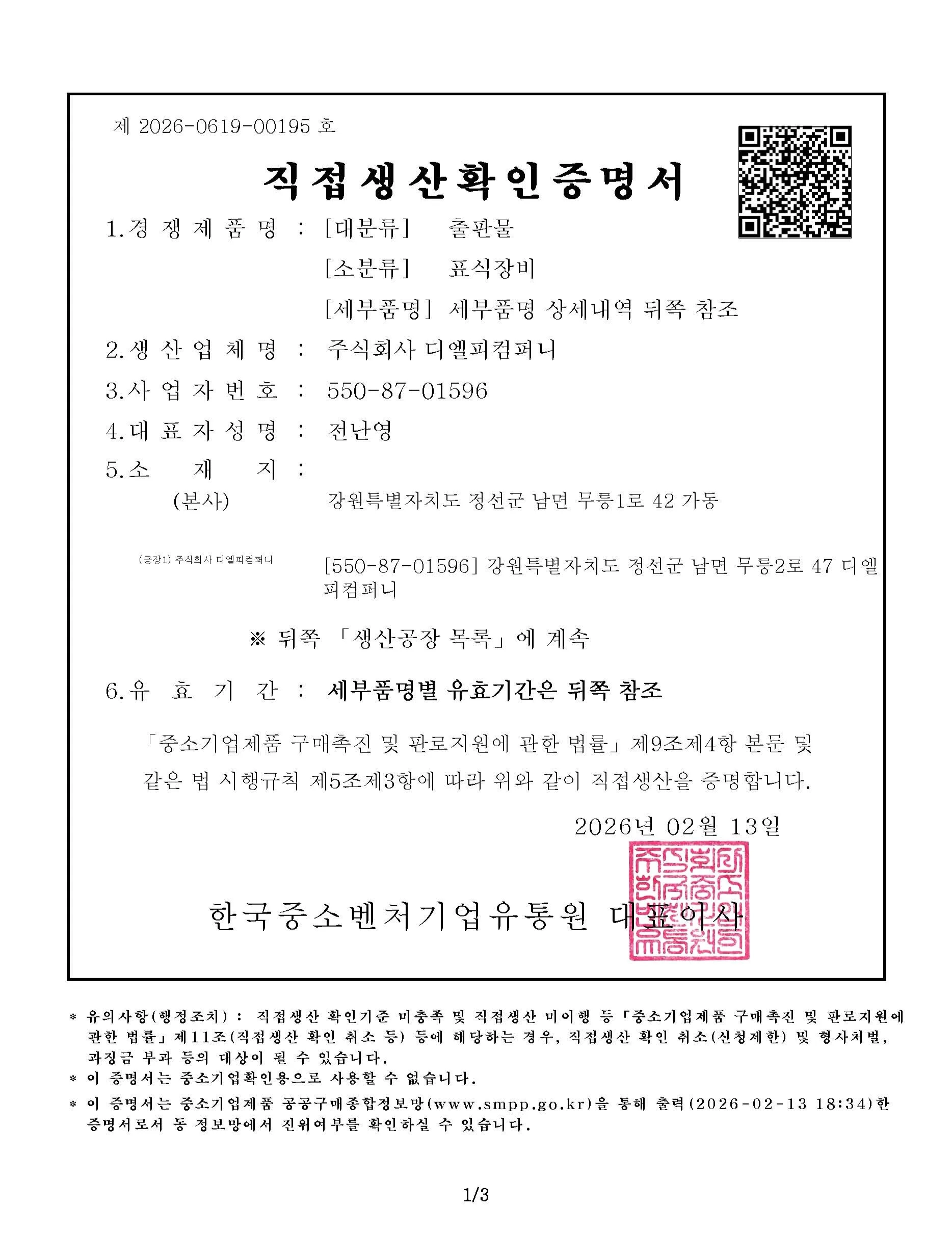 직접생산확인증명서 : 안내전광판